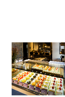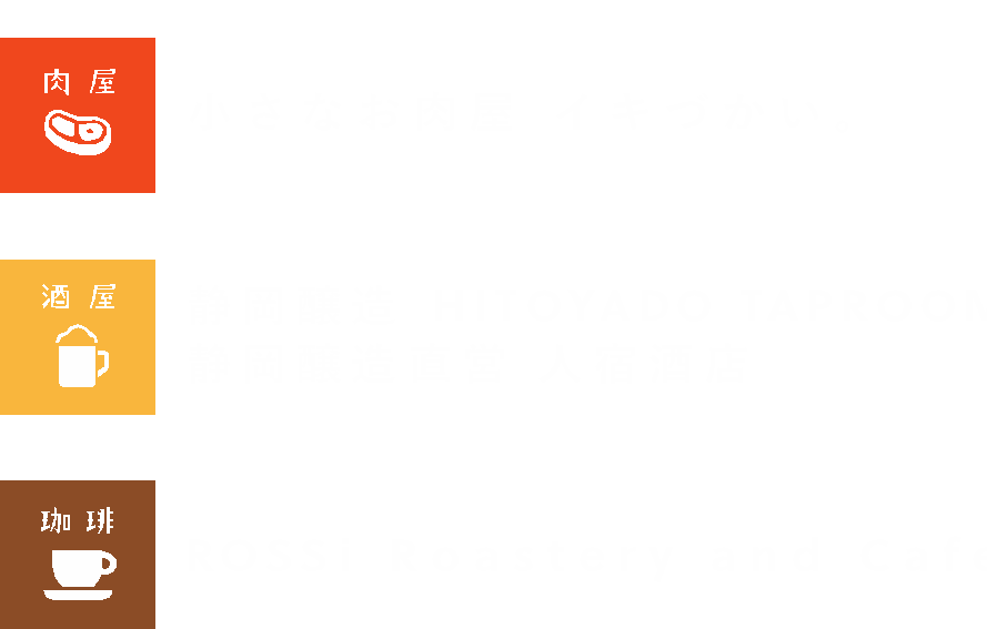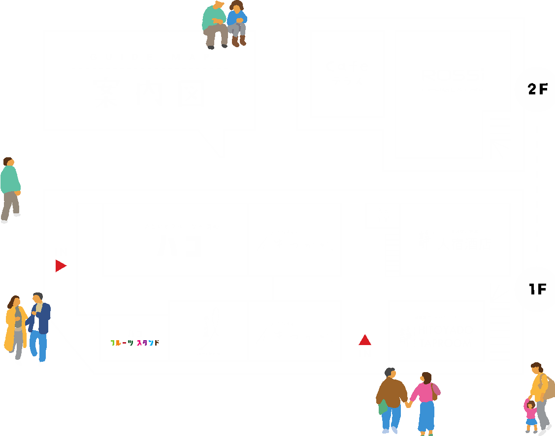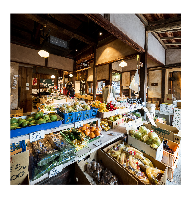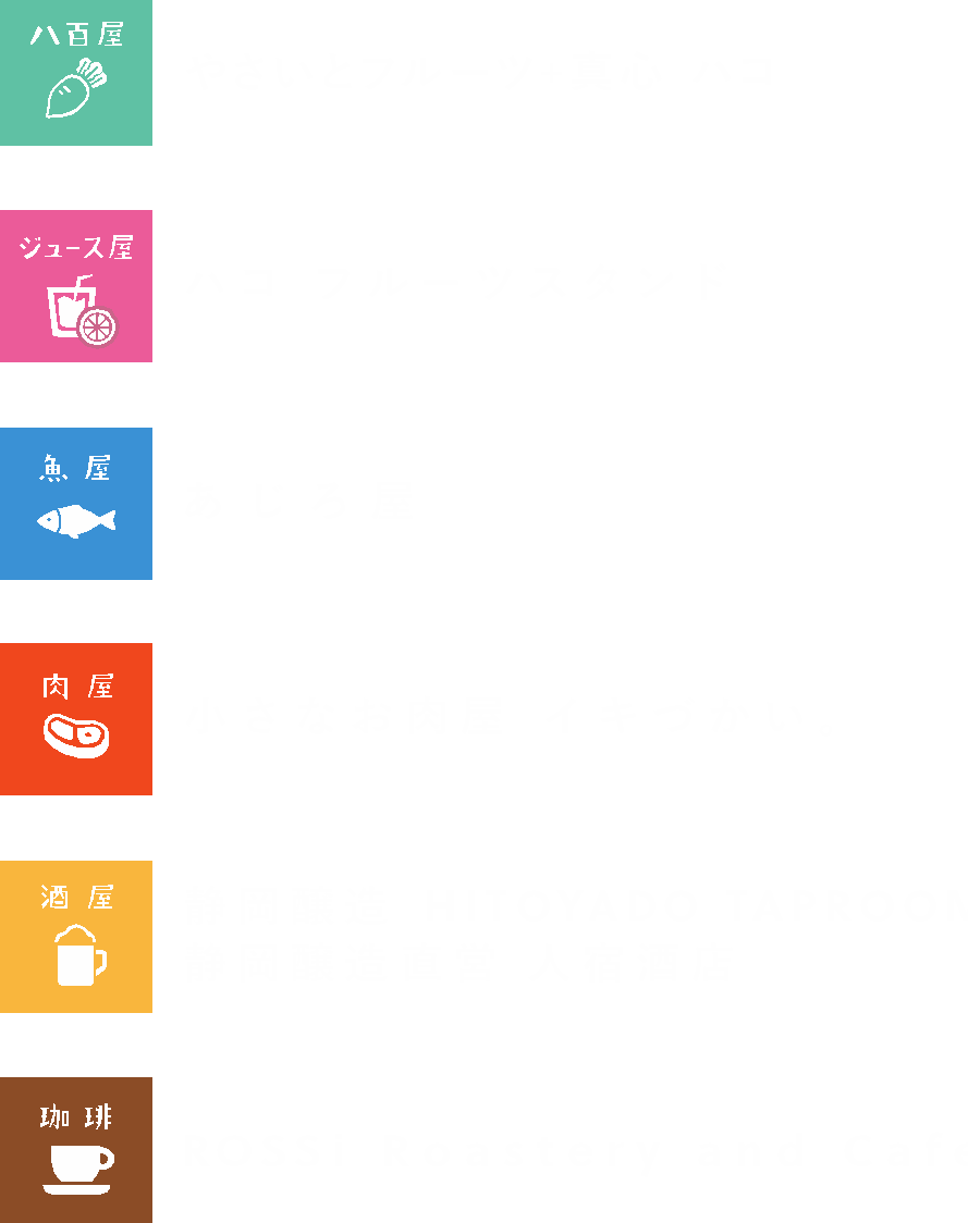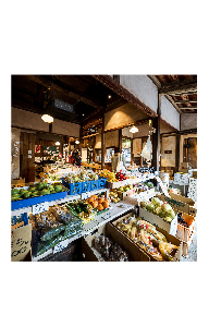 母屋に八百屋、ジューススタンド、魚屋、肉屋、奥屋に酒屋、喫茶店が終結。