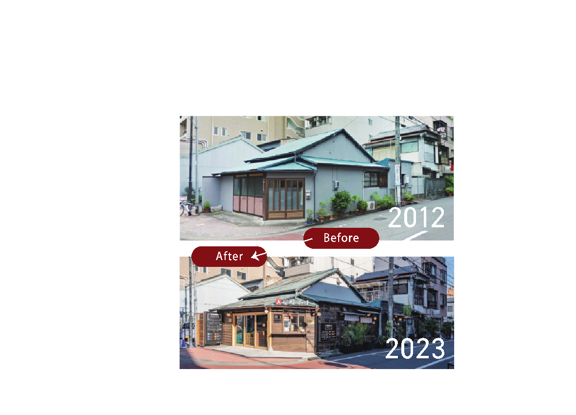 母屋と奥屋との間に中庭を配したこともポイントで、屋根も設置。買い物に来た人、飲べたり飲んだりしに来た人がこの庭で出会い、世代を超えた井戸端会議や立ち飲み二ケーションを楽しむ場になれば…。