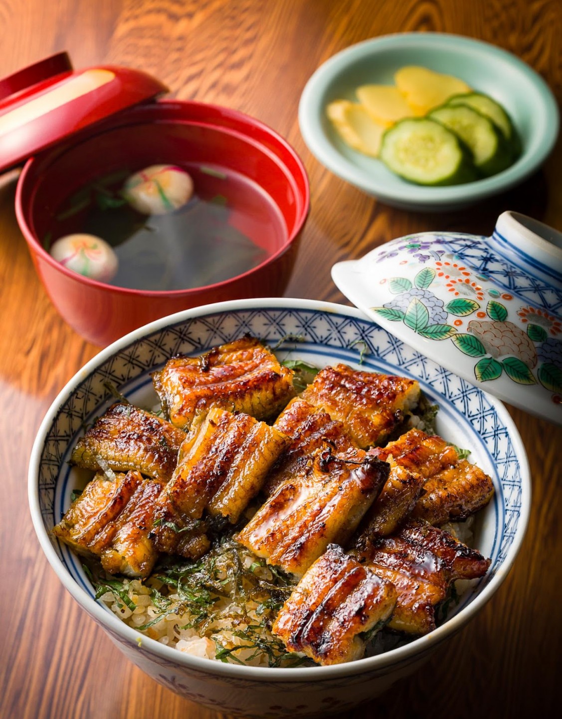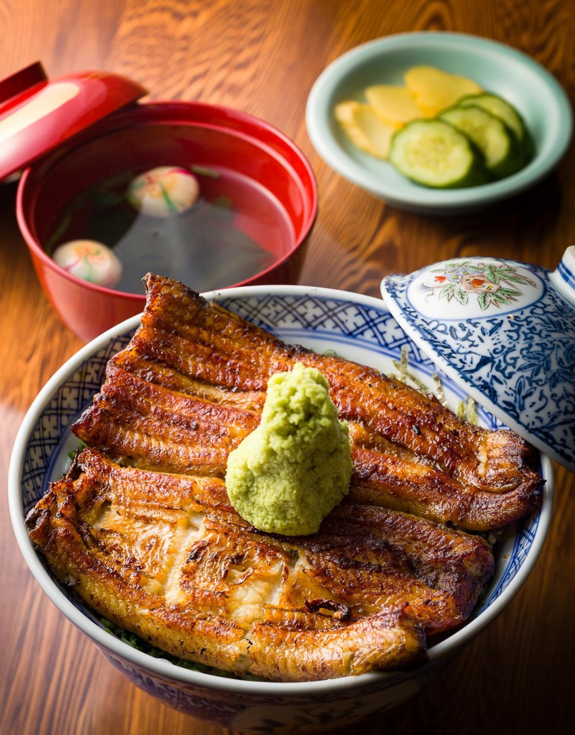 昭和元年創業の老舗鰻店の一番人気は「うな重」。蒸してから焼く関東風で少し甘めのタレがご飯にもよく合う。隠れた人気の「うな梅丼」は梅をまぶしたご飯に蒲焼をのせた丼で、クセになるおいしさ。たっぷりのワサビで食べる「うなわさ丼」の蒲焼は甘みを抑えたタレがポイント。刻みネギも入り、さっぱり味わえる。王道でいくか、気になる丼でいくか、悩むところだ。